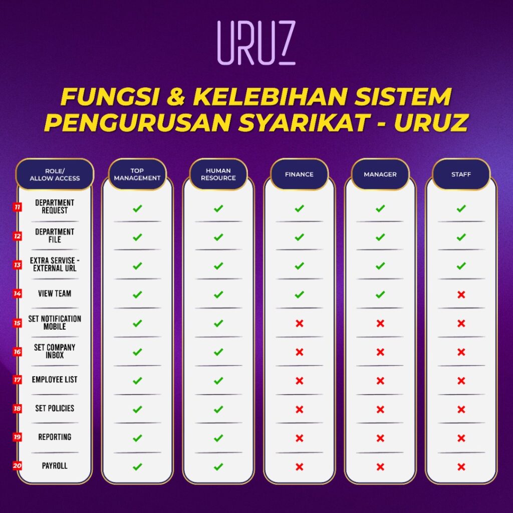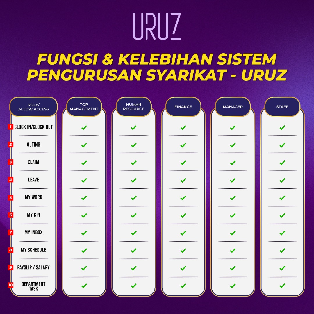 URUZ merupakan sebuah sistem yang dibangunkan khas untuk anda yang suka menguruskan syarikat dengan sistematik. Paling penting, menerusi URUZ anda akan dapat menijmatkan masa dalam menentukan kualiti staf menerusi data serta analitik yang terdapat di dalam URUZ. Bahkan anda juga boleh mengubahsuai sistem ini mengikut cita rasa syarikat. Jom kita baca dahulu kelebihan yang sudah tersedia ada di URUZ hari ini.